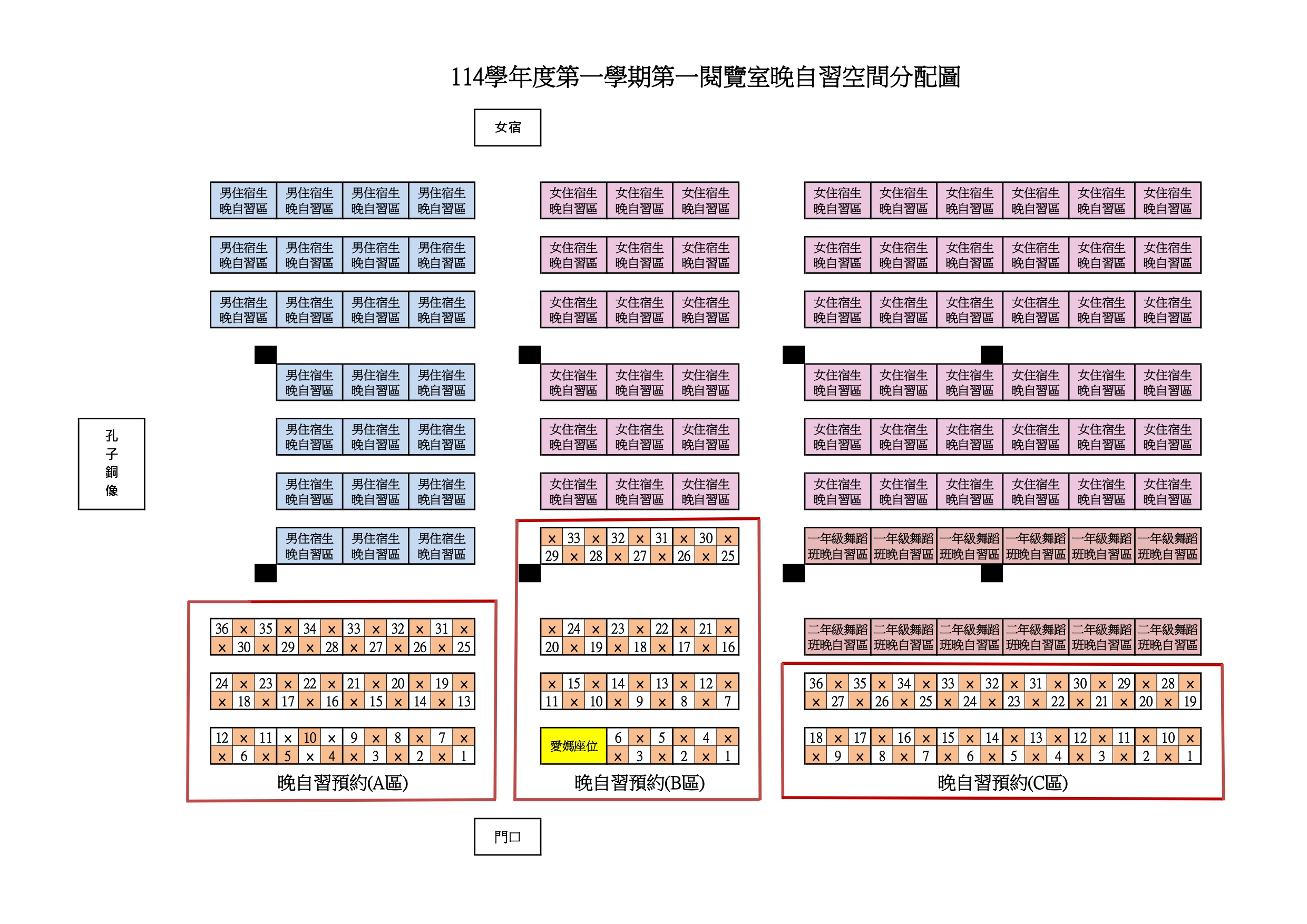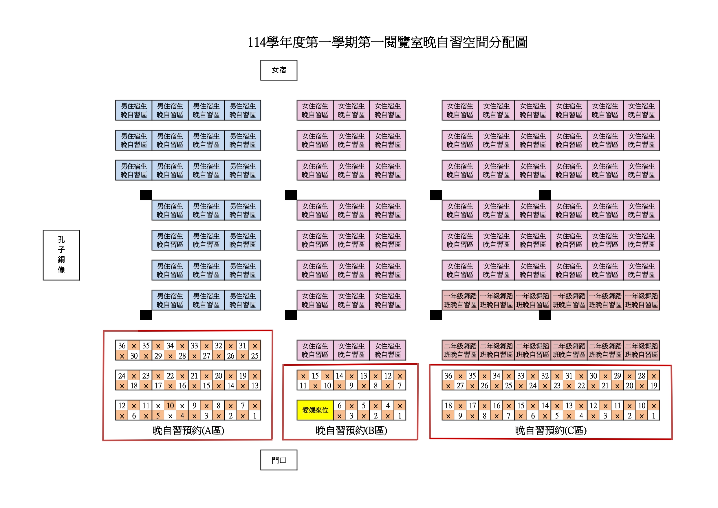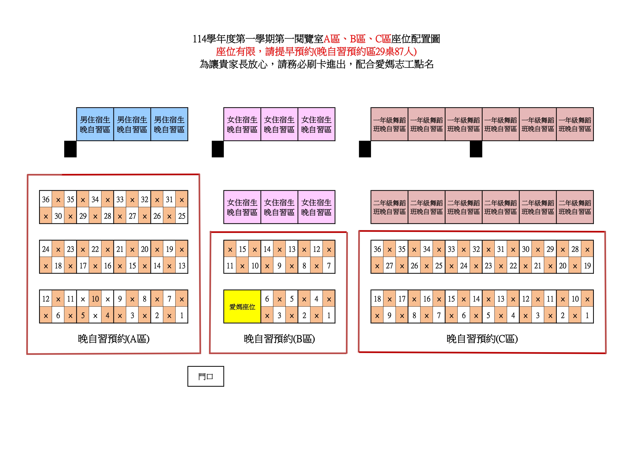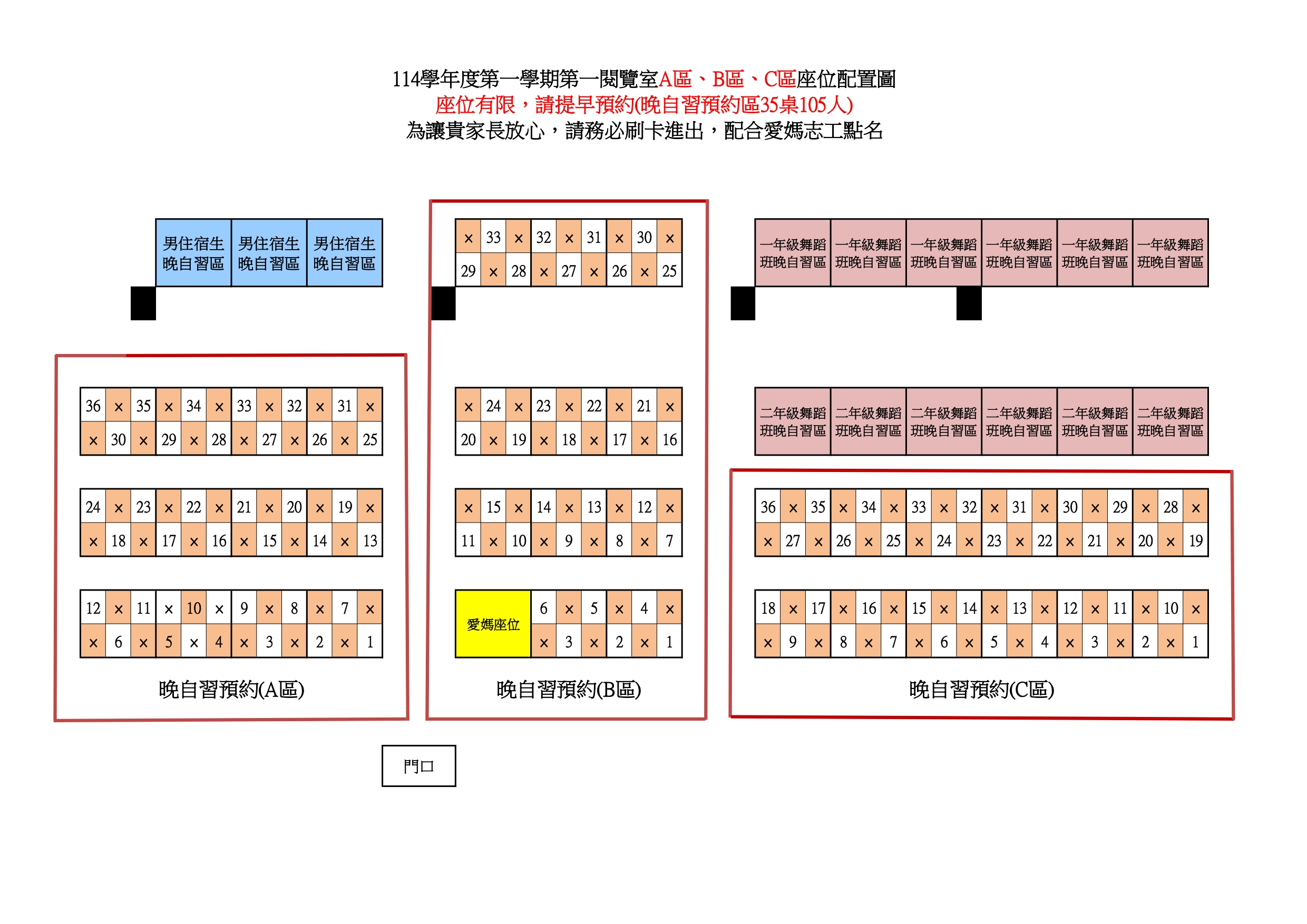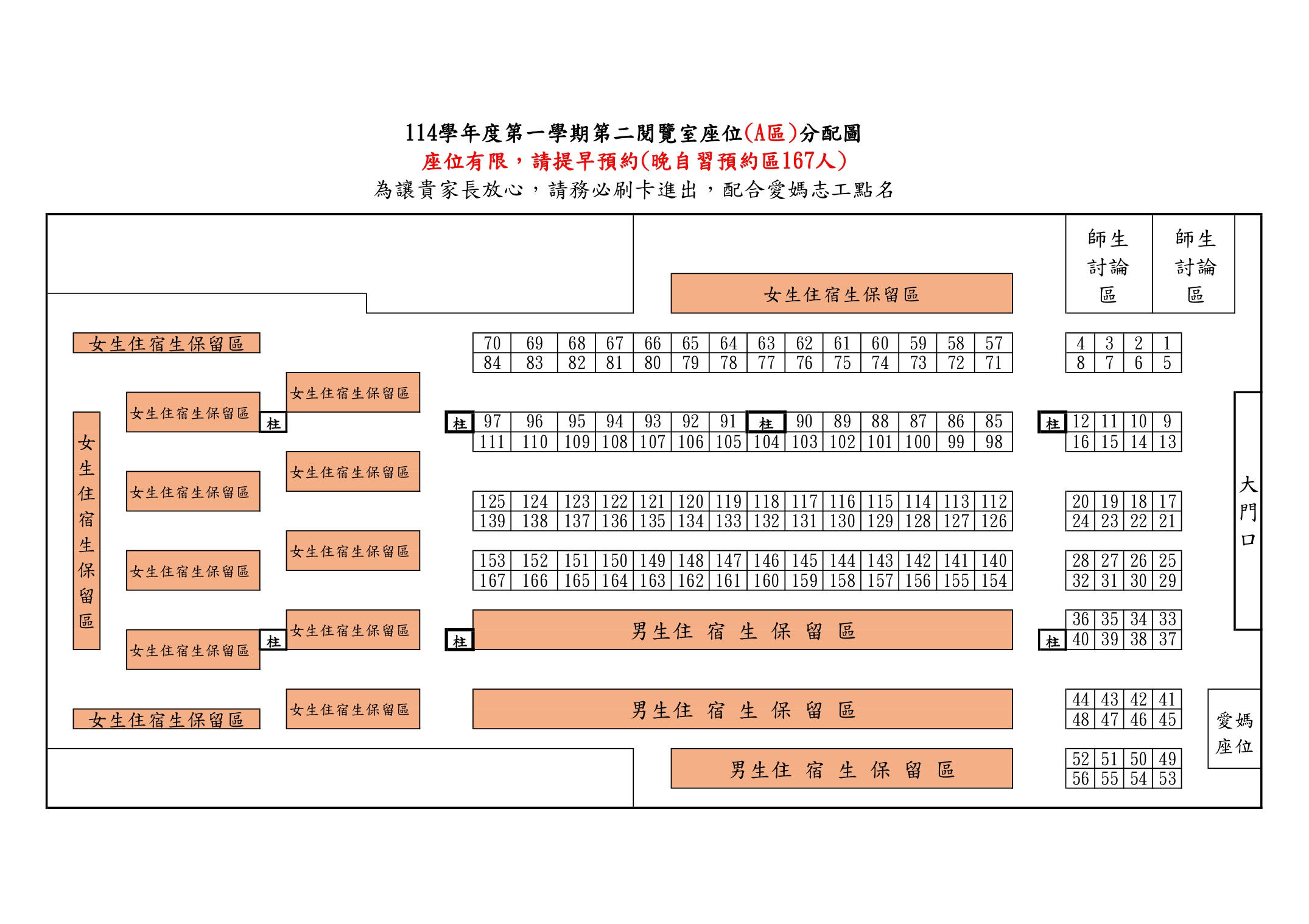 【重要通知】114學年度第1學期第一、二閱覽室晚自習開放時間及座位配置圖