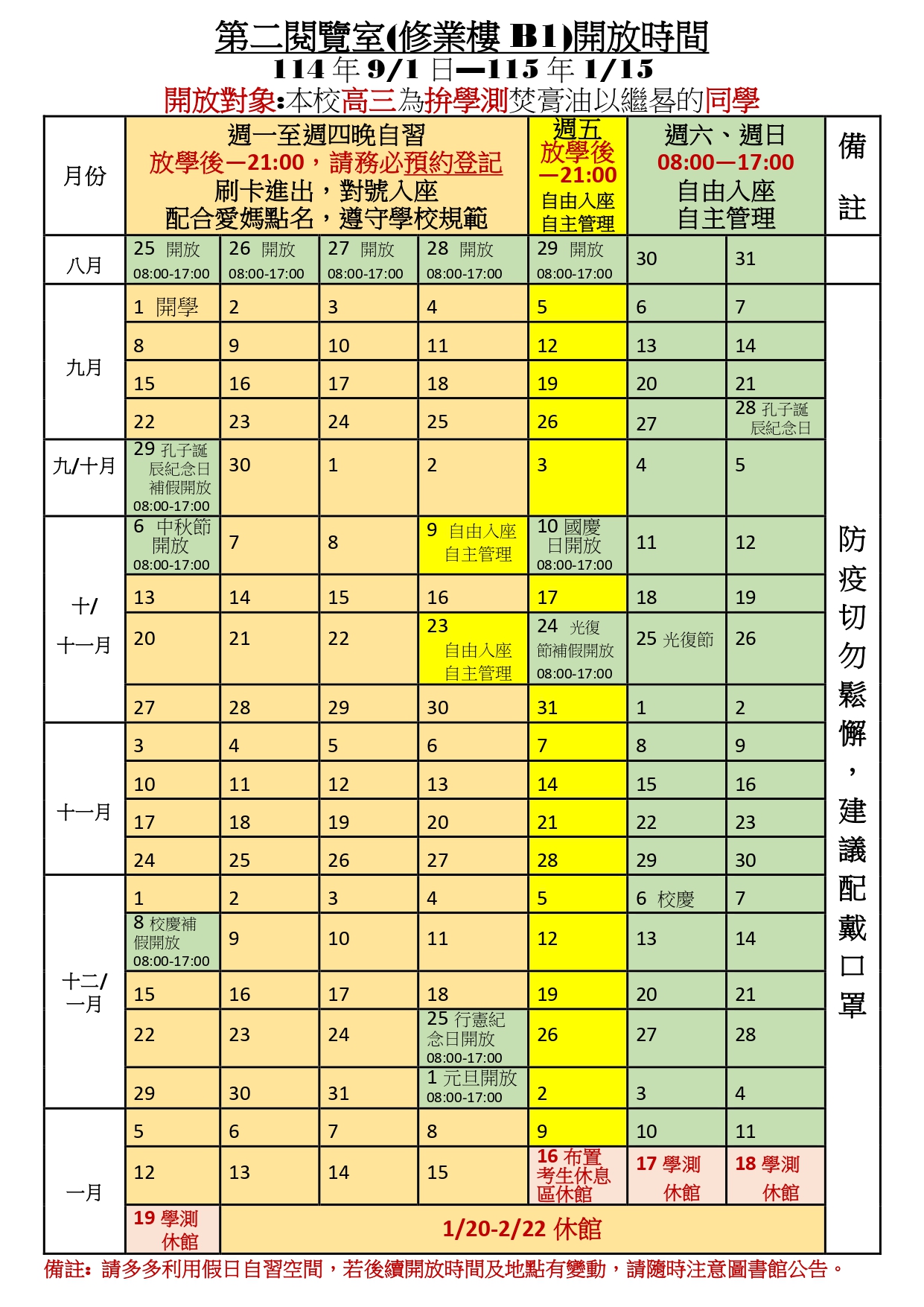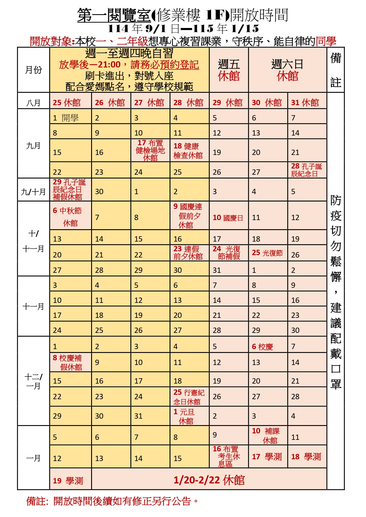 二、114年08月29日(星期五)開放預約,09月01日(星期一)開始晚自習,開放時間為每週一至週四放學後-晚上21:00、週五放學後-晚上21:00(僅開放第二閱覽室)。