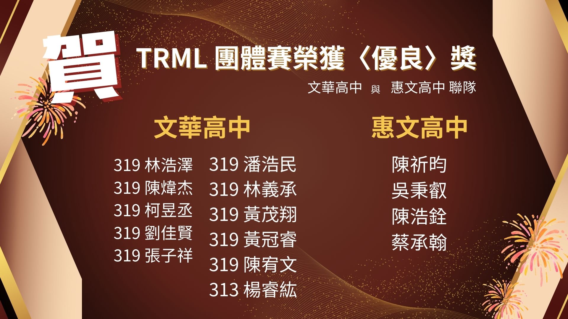 【恭賀】本校TRML 團體賽榮獲優良獎