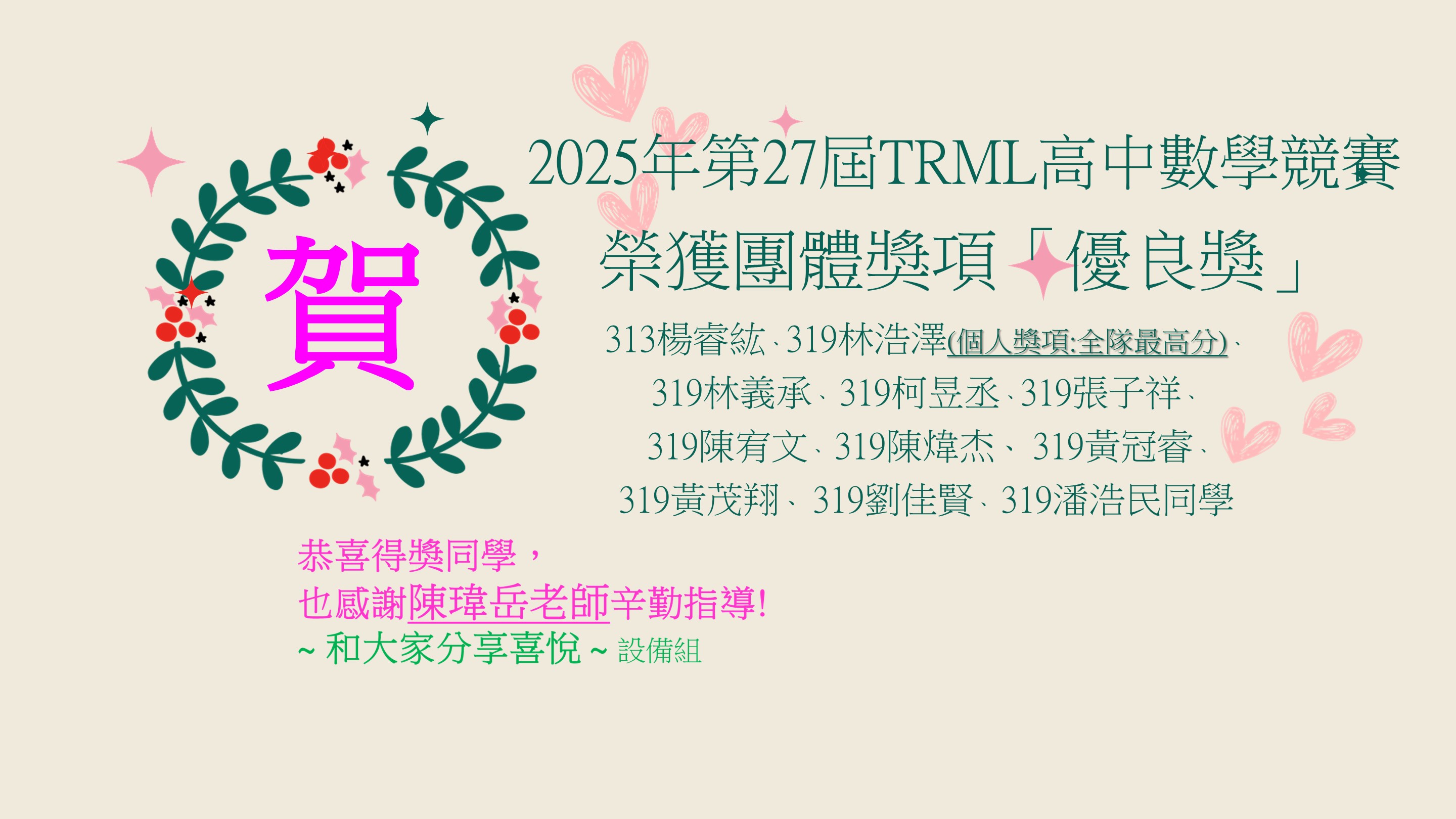 賀!本校學生參加2025年第27屆TRML高中數學競賽榮獲佳績