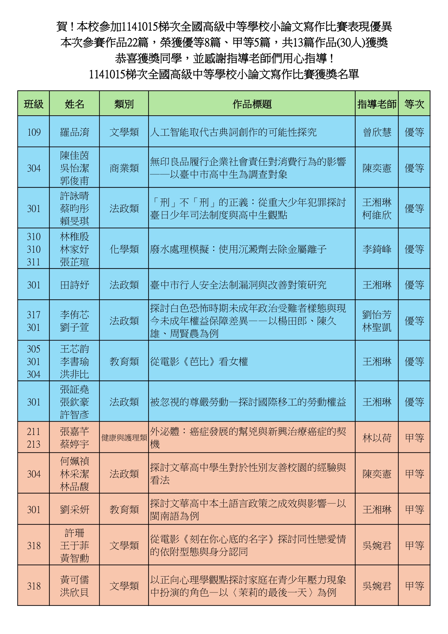 1141015梯次全國高級中等學校小論文寫作比賽獲獎名單